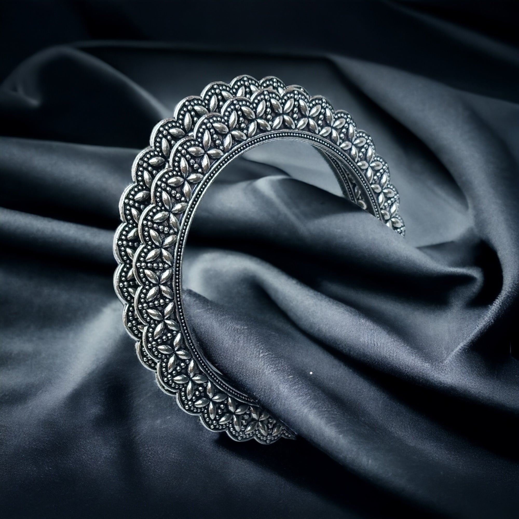 These Antique German Silver Oxidized Kada Bangle Pairs are crafted with traditional techniques and design, made from high-quality silver for a lasting shine. The oxidized finish...