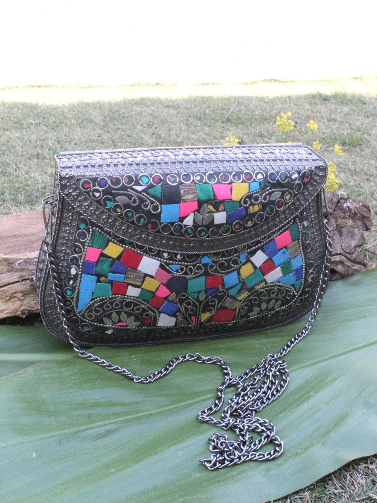 Elevate your style with our Black Metal Multi Stone Mosaic Clutch. The intricate design features a combination of stones, adding a touch of elegance and versatility...