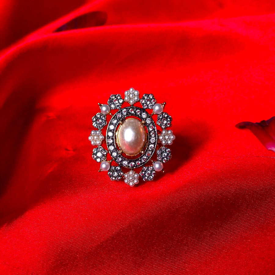 Golden Black Floral Ring With White Crystal